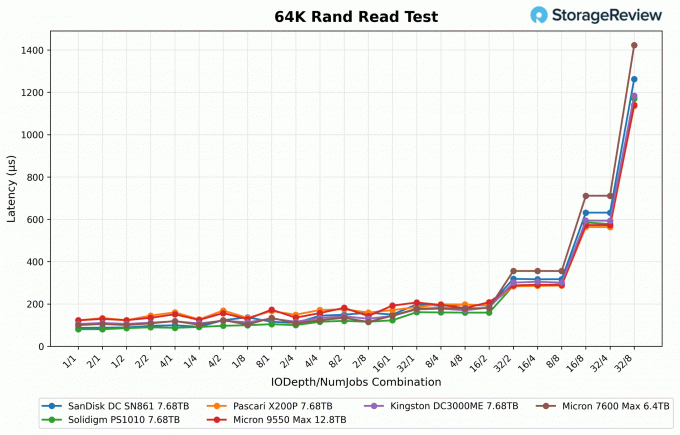64K रैंडम रीड टेस्ट में, Micron 9550 Max (12.8TB) ने एक मजबूत विलंबता प्रोफ़ाइल बनाए रखा, औसत 0.25ms के साथ, 0.12ms के निचले स्तर और भारी भार के तहत 1.14ms तक के शिखर के साथ।.4TB) ने बहुत समान आंकड़े दर्ज किए, औसतन 0.26ms, 0.10ms के रूप में कम गिर गया, लेकिन अधिकतम 1.42ms तक थोड़ा अधिक चढ़ गया। दोनों माइक्रोन ने स्थिर विलंबता प्रदान की,रन के अधिकांश के लिए क्षेत्र के बाकी हिस्सों के साथ कसकर समूहीकृत रहने.