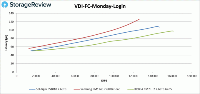 वीडीआई एफसी सोमवार लॉगिन के लिए, पीएस1010 ने 107 माइक सेकंड पर 147K IOPS के साथ दूसरा स्थान हासिल किया।